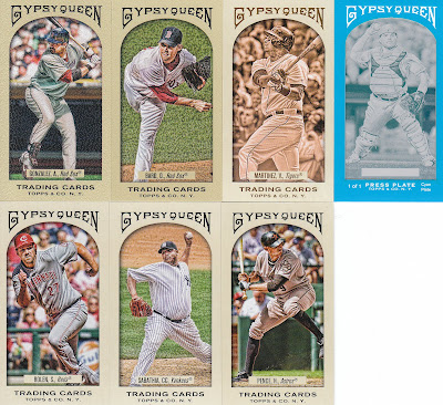 After the group break last week, I was solidly hooked on Gypsy Queen. I wanted more... I know, I sound like an addict... I have admitted this... well, three boxes later I'm left with nearly a complete set and a nice stack of hits... I don't have video, because the shop owner wanted to watch and see what I got, so I opened them all there at the shop and he hooked me up with a bunch of supplies for spending so much money... So, first of all, let's go with the mini's: